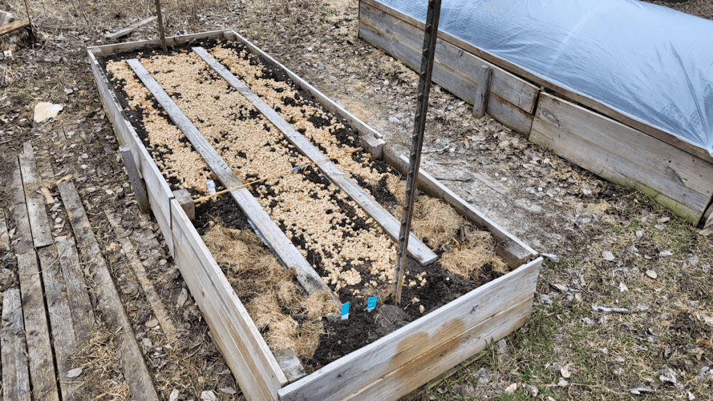 We have three types of potatoes on the way. Two at 5kg/11 pounds and one at 1kg/2.2 pounds. We will likely break the spaces covered by the tarps into 4 beds with paths, if only to make things easier to reach. We may plant the two 5kg types of potatoes here, and find somewhere else of the 1kg of potatoes. Maybe use one of the two grow bags I picked up on sale, for such a small amount.
