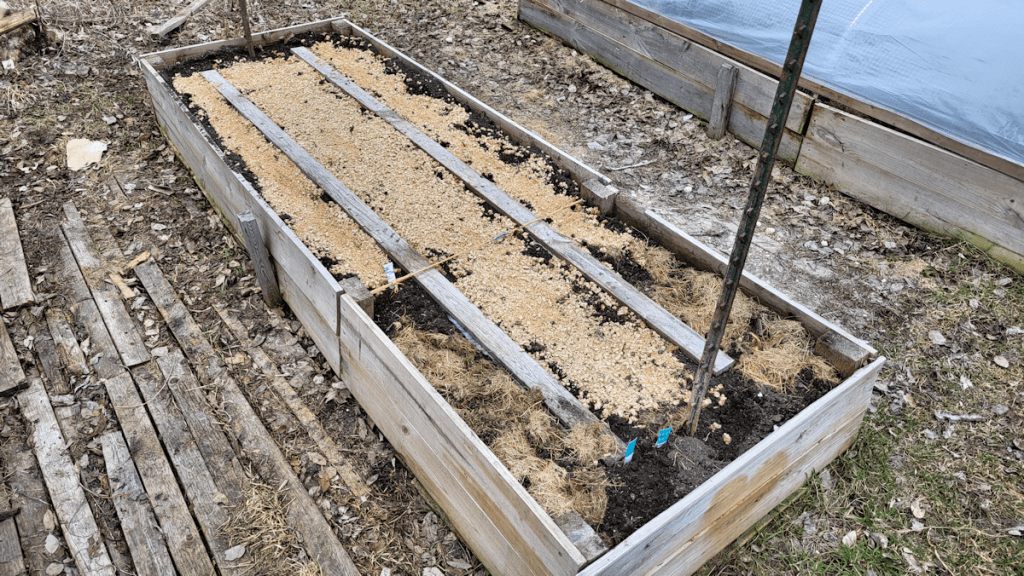 Now that there is no longer mulch insulating the ice, it should be melted by the end of the day. We’re at 18C/64F as I write this, so it won’t take long for the beds to thaw, and the garlic can start growing again.