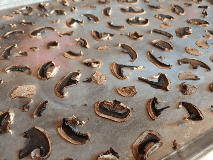 With that in mind, I very deliberately sliced the mushroom pieces quite thin, before laying them out on baking sheets to dry. I had enough button mushrooms to fill one sheet, while the other was filled with shitake and crimini mushrooms. The “warm” setting on our new oven is 175F, but I put it at the lowest temperature it would go: 145F. Then I left the trays in the oven overnight.