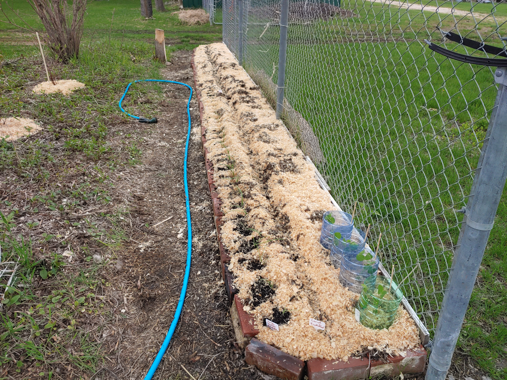 My focus for today was on the beds with carrots in them, both winter sown and spring sown. I started on the East yard garden bed, removing the bamboo stake trellis that was holding up the radish bushes, first.