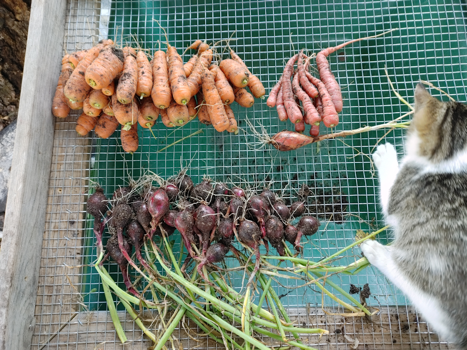 With these ones, we’ve been thinning by harvesting, as needed. That gave them space to get bigger… but they didn’t get much longer! These are supposed to be a deep red and quite long. Instead, we have light orange and stubby.