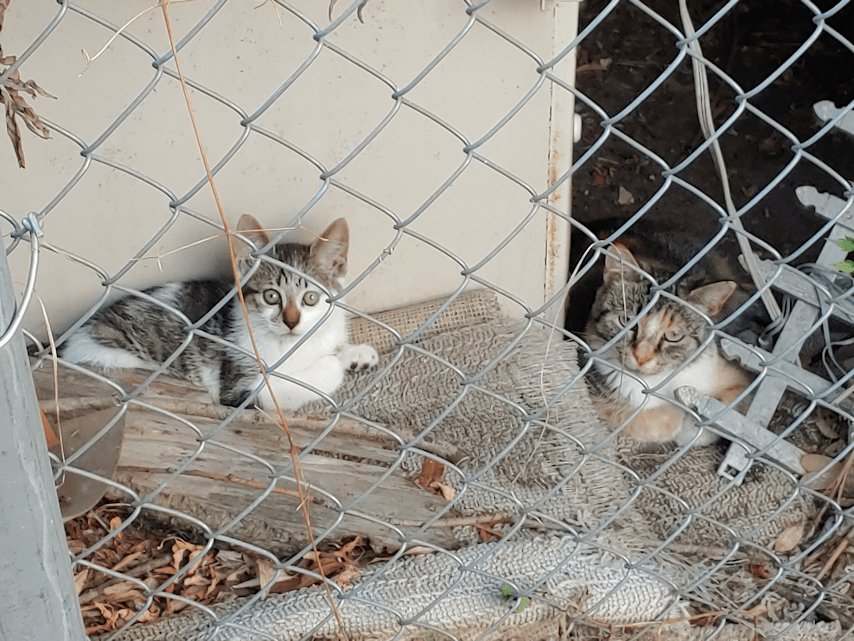 So I had no doubt little grey tabby was returning to its next under the pile. I took a couple of zoomed in photos, but didn’t try to come any closer, as I made my way back to the house, where I saw Junk Pile (or her doppelgänger; I can’t tell them apart unless they are next to each other, and I haven’t seen one of them in ages) cross the yard to the covered pile. When I came around the lilacs, I startled a little white and grey kitten! As I slowly paused and took its picture, I spotted another kitten peeking at me from under the down spout. When the two of them got together, I had to try and get some video. The image quality drops off the more I had to zoom in, but at the end, another white and grey kitten is there with Junk Pile – and this one is much larger than the others! I’ve no doubt they’re being cared for together as one litter, but the last white and grey kitten is clearly older.