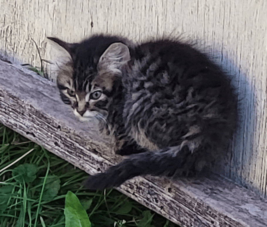 Just a little while ago, my daughter and I headed outside for a bit (more on that in a separate post) and had to go into the old garden shed. My daughter spotted a kitten on the log pile that I completely missed!