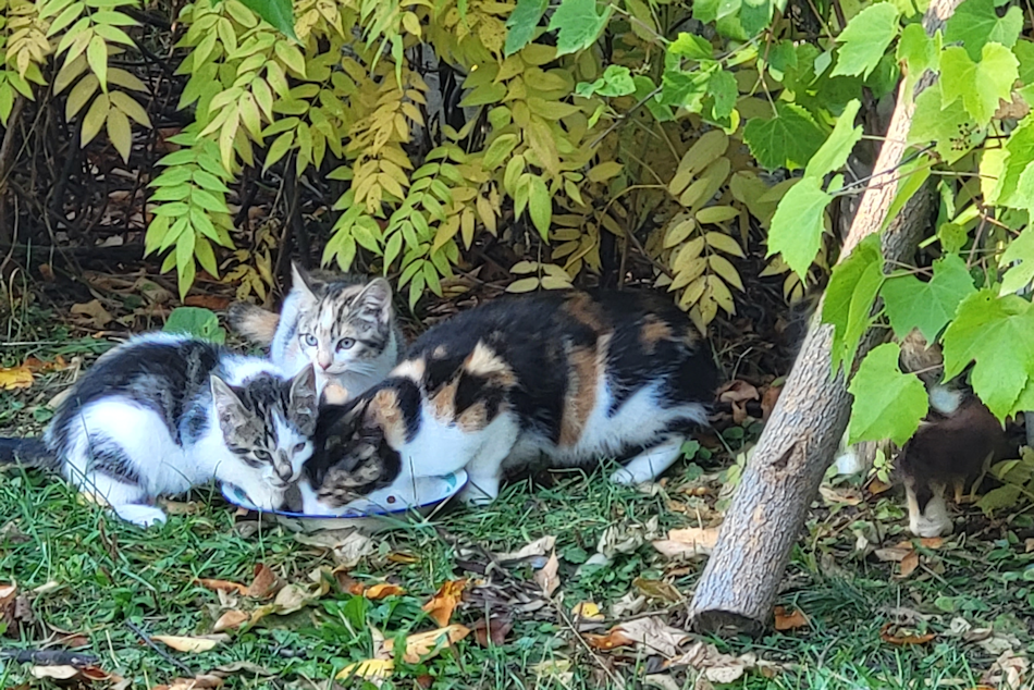 You can just barely see Brussel on the far right, under the grapes. At the bowl is her sister, Sprout, and two older kittens that I’ve started to see more often. The one looking over the heads of the other two is a muted calico. I think the both of them are Sprout’s babies, but I don’t know for sure.