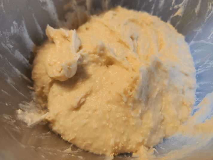 By this point, I was working the flour in with my hand rather than trying to stir it with a spoon. If you have an electric mixer with a dough hook, go ahead and use it!
