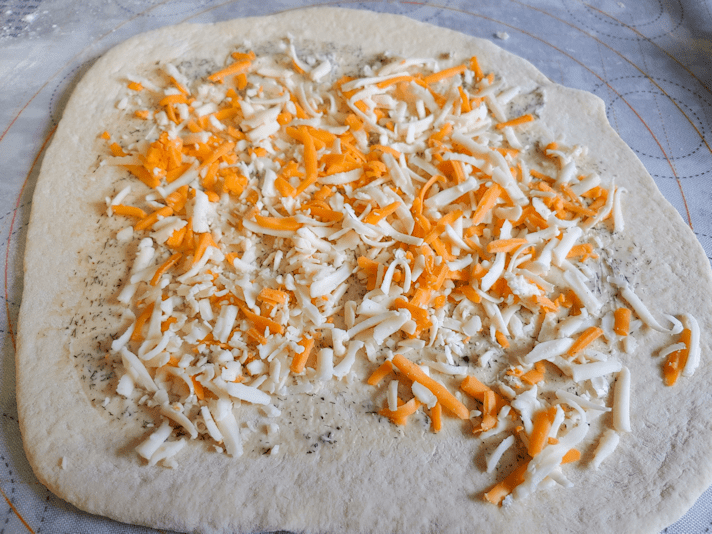 Each piece was rolled out, then small pieces of leftover ham were scattered evenly, followed by generous amounts of shredded sharp cheddar, mozzarella and Monterey Jack cheese.