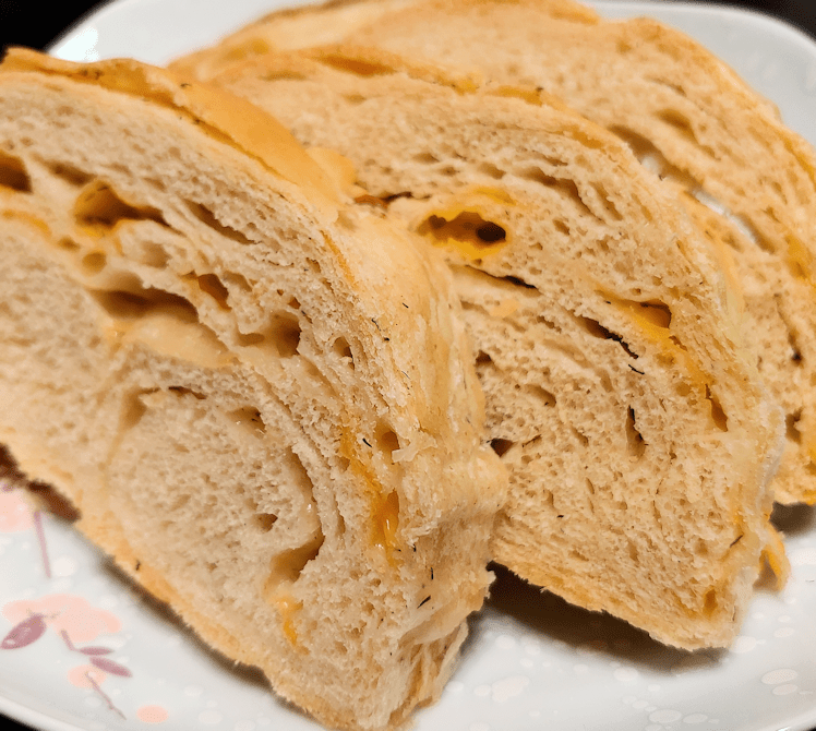 For the other half, I was going to do a cheese roll, but my daughter suggested rolling and folding it. With the extra gluten in the durum wheat flour, it could actually handle that, so I have it a try! This time, I made two loaves.