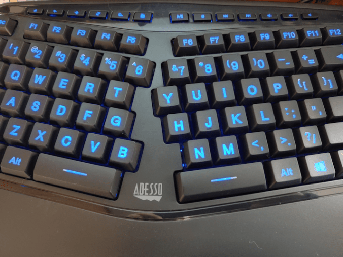 The ergonomic split keyboard is a must for me, but having a light up keyboard was also preferable, so that I could see it without having to shine my desk light on it, blinding myself every time I looked up.