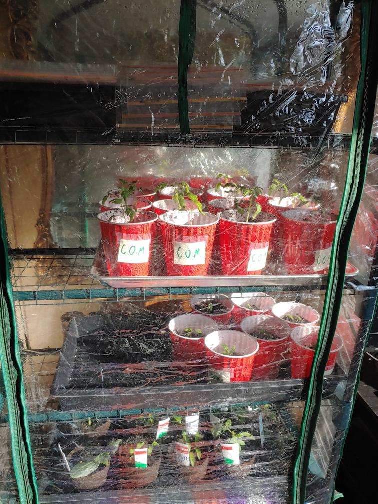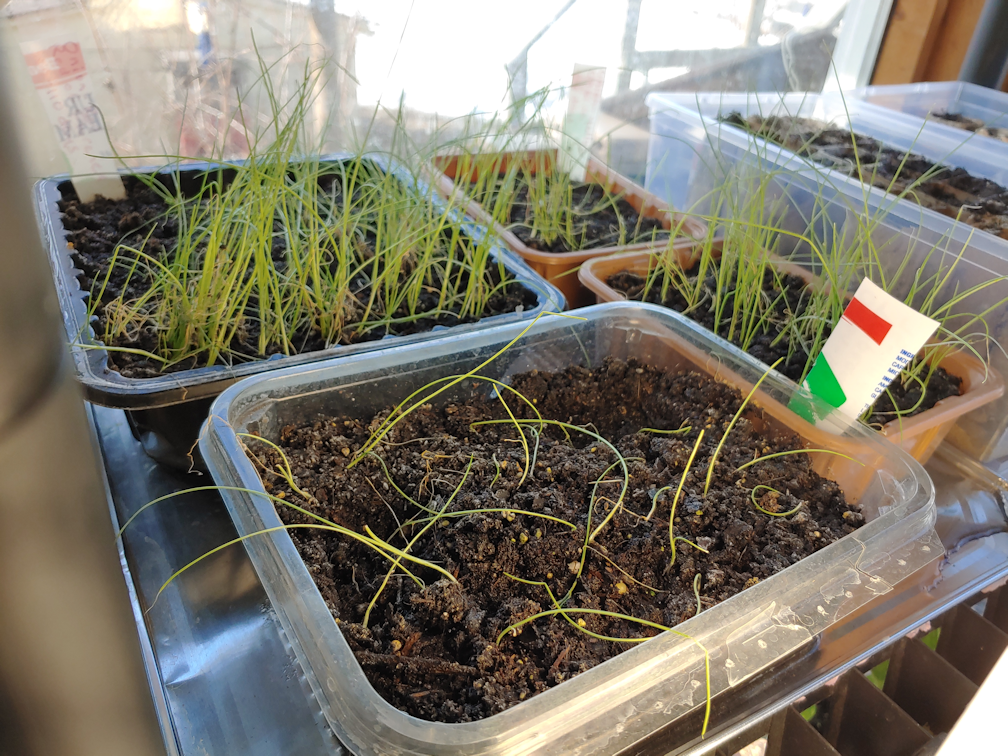 Her sister ended up helping me bring the transplants back inside after everything we done. She was up sick much of the night, but was finally feeling better. It was a bit of a juggle, since the chitting potatoes were sitting on the platform the seed trays and most of the bins sits on. Those had to go outside and onto the roof of the cats’ house until all the transplants were brought into the sun room, then we had to figure out how to fit the potatoes back in! Some ended up on the swing bench under the platform. Potato Beetle has lost his favourite bed for now. :-D
