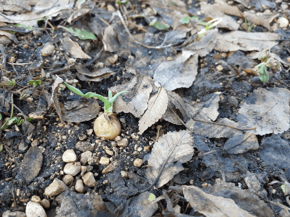 As for the peas, I cut some of the plastic bottles from distilled water we have so many of, to put around the peas, to protect them from the wind. One of them blew away while I was transplanting onions. I’d tried to push it into the soil, but there turned out to be too many little sticks in the leaf litter. :-D Once I got that fixed, I added the sticks to help keep them from blowing away. They are the sticks sold for toasting marshmallows, broken in half. We got a package for cookouts last year, but I’ve been using them as supports for some of the taller squash and gourd plants that were starting to flop around a bit. They work really well for that!