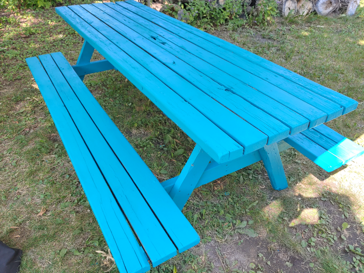 When we first got this table, it was a sort of reddish brown colour. I think the provincial parks department got some sort of deal on the paint because, for a while, all park benches and picnic tables were painted that same colour! There’s no sign of it now, though I can see that someone did paint it a different grey some time before my mother’s final coat of blue-grey.