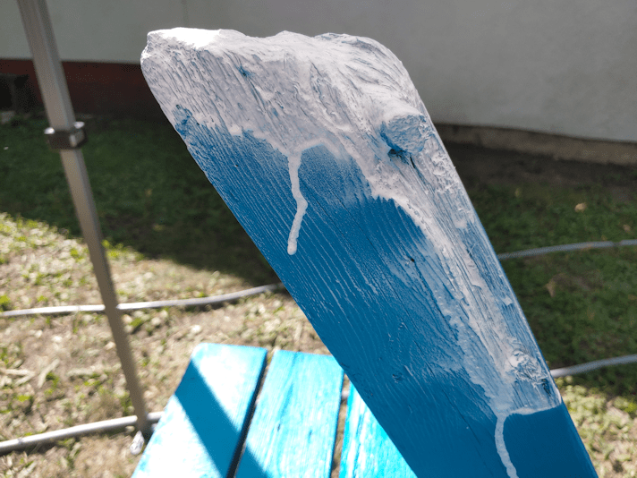 It’s also a lot lighter and thinner than I expected. Which I suppose is exactly what I need to fill in all those crevices. I added extra along the part where the most rotted wood had come off on the one leg.