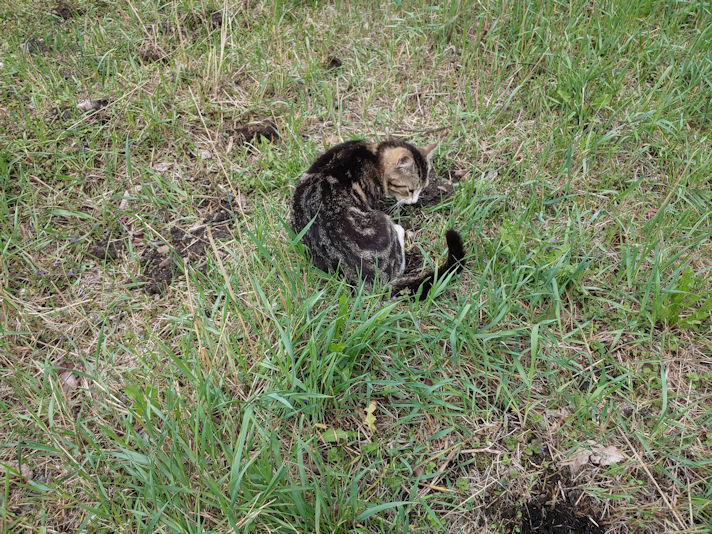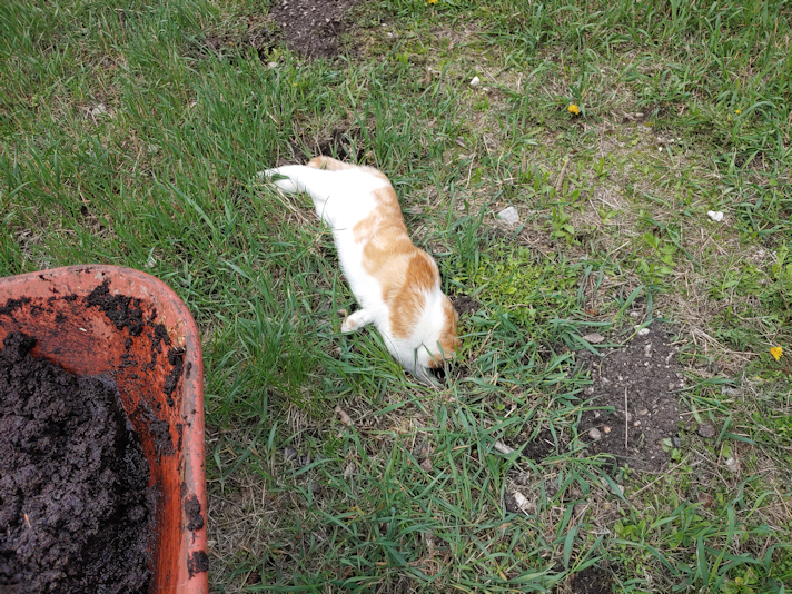 Then he moved over to the next hole and sat over it, watching me. When I moved to fill that one, he went to the next one and lay down.