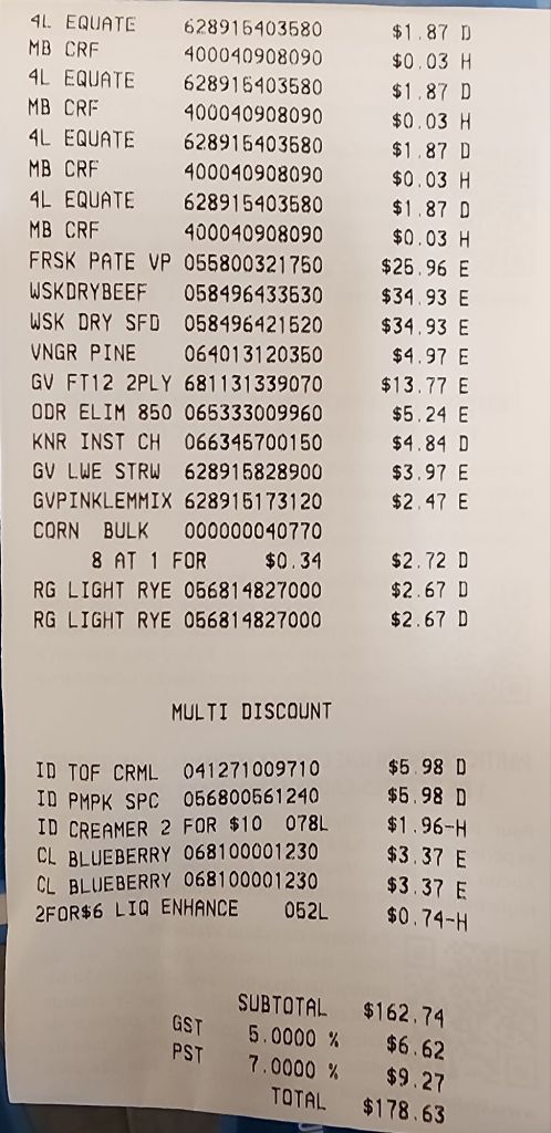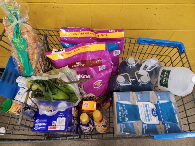 The most expensive items were the two bags of kibble, plus a case of wet cat food. I also got a box of pet stain/odour remover, to cat supplies alone were in the $100 range.