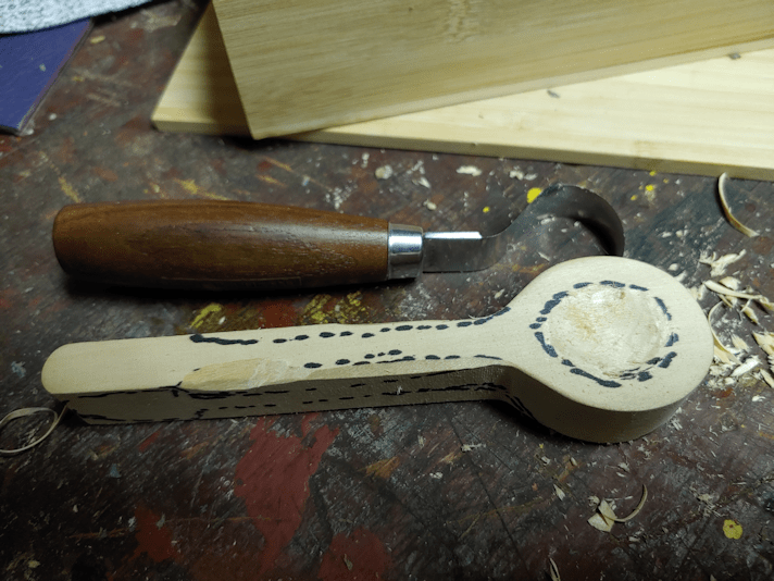 In an attempt to get at least something done today, I decided to continue practice carving on the spoon blank that came with my carving kit. After my husband was able to sharpen the curved blade of the sloyd knife, I had been able to test it out a bit, but not much more.