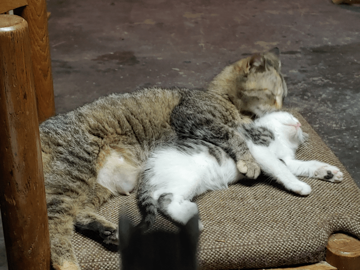 Turmeric’s head is actually visible in the above photo. It’s just hard to see it against Saffron’s belly.