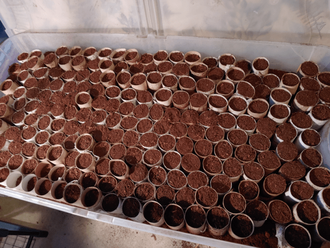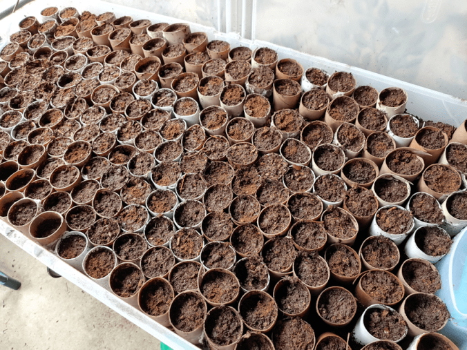 Today I took my mother to her doctor’s appointment, so I got very little garden stuff done today. Last night, however, I was able to start prepping the toilet paper tubes we’ll be using to start the Montana Morado corn in.