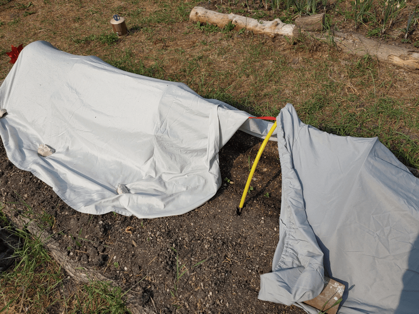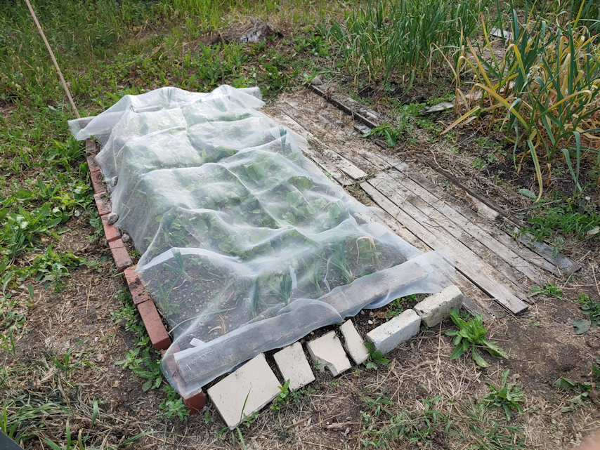 This bed was getting the most difficult to tend to with the high winds, so when I took the cover off to water it, I spent a lot of time securing the plastic after the cover was put back on. The plastic on all the beds is meant to be there only until the plants establish themselves and don’t need as much warmth or protection. It will likely be replaced with netting later in the season. So securing the plastic involves a lot of rolling and carefully tucking under the frame. With this one, that also meant completely redoing how it was weighted down on top. Hopefully, it will hold. We’re expecting high winds again, in a few days.