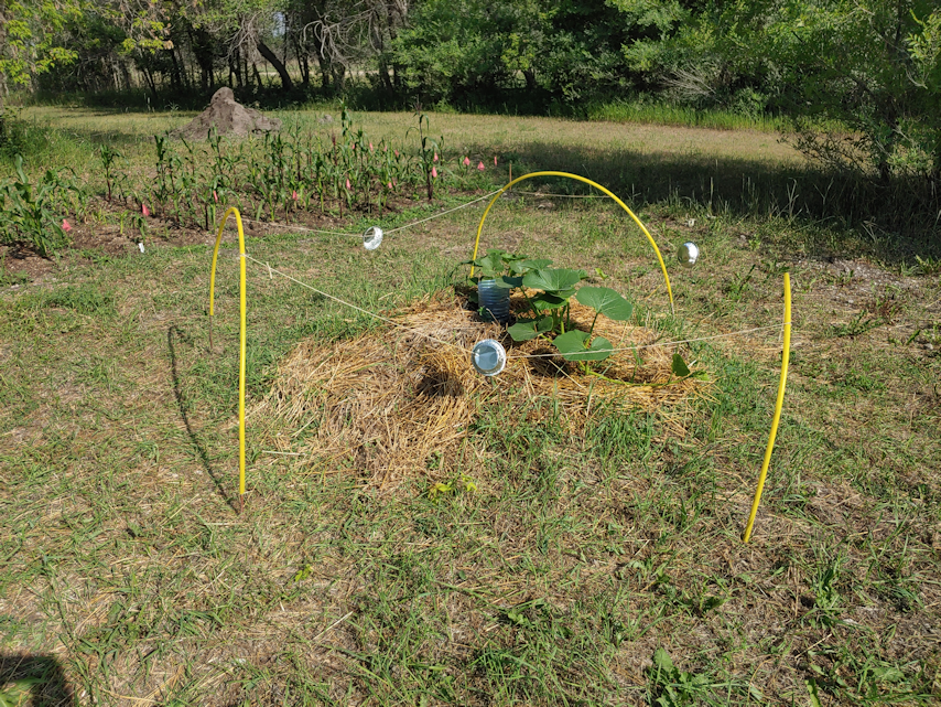 The hoops are supporting a plastic mesh that is stiffer than netting, but more flexible and easier to work with than hardware cloth. As you can see in that first photo, it’s wide enough that it creates more shade, so this is a cover that would be idea to use for things like lettuces, which like more shade. The plastic mesh does sag when the cats jump on it. My plan is to add horizontal supports in between the hoops. These would keep the hoops at the ends from being pulled inwards, plus keep the plastic mesh from sagging downwards. I am hoping it will only need horizontal supports across the very top, but it might need more halfway up each side, too.