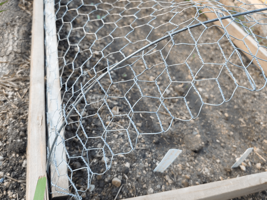 The cover that we have over the old kitchen garden bed is the one that was made using fence wire. When it was done, I swore I never wanted to work with that again! It’s so thick, I had to double up the frame on the sides to secure it in between, then double up the ends, just to keep it from falling apart. However, while it was on the high raised bed, I found it worked out really well, in that I could reach through the wire to tend to the bed, without having to remove it. The openings are not all the same size, though. It’s meant to be installed with the narrower openings at ground level to keep small critters out, while the larger openings at the top are all that’s needed to keep mid sized critters out. Which means there are spaces where I cannot fit my hands through, but I can still reach around from other openings.