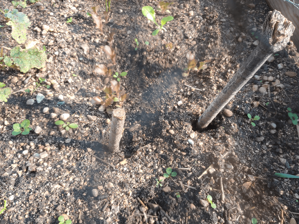 There are more sprouts coming up in the mesh covered bed at the chain link fence, though still just the one pea shoot. This is the bed that has Dalvay shelling peas, a few King Tut purple, Royal Burgundy bush beans, Hopi Black Dye and Mongolian Giant sunflowers, a few black Montano Morado corn seeds, plus onion seeds. So there should be more pea seeds showing, as peas prefer to germinate in cooler soil. That suggests to me, most of the peas did not survive the winter. As for the sprouts I am seeing, about all I can say right now is that none of them are corn.