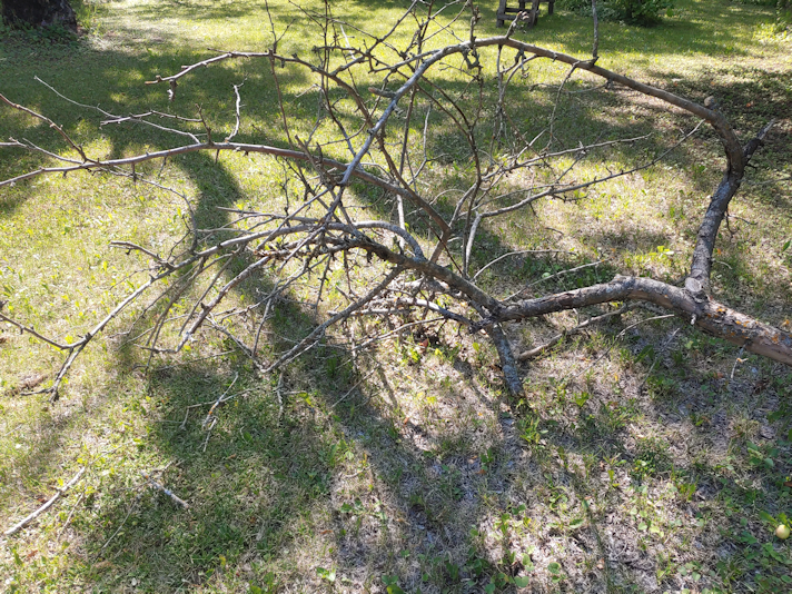 When I finally got things clear enough to start using the chain saw on the crab apple tree, Syndol decided that would be a good time to climb the tree! I even cut away a broken section while he was up there, hoping the noise would have him jump down, but nope! In the end, I dumped another load of branches and came back before he finally made his way down.