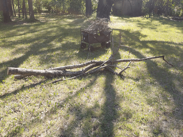 Then it was more cutting and clearing and cutting and clearing. Crab apple tree branches are so bent and twisted, they took a remarkably long time to deal with. The wood is so much heavier, too. The difference is quite noticeable when I had pieces of apple tree cut quite short to load into the wagon and haul away, then tossing them on top of the pile, then started working on the spruce tree. I cut sections that were much longer than the apple tree trunk pieces, and the spruce tree’s trunk was at least twice as think at the top section of the tree, yet were so much lighter!