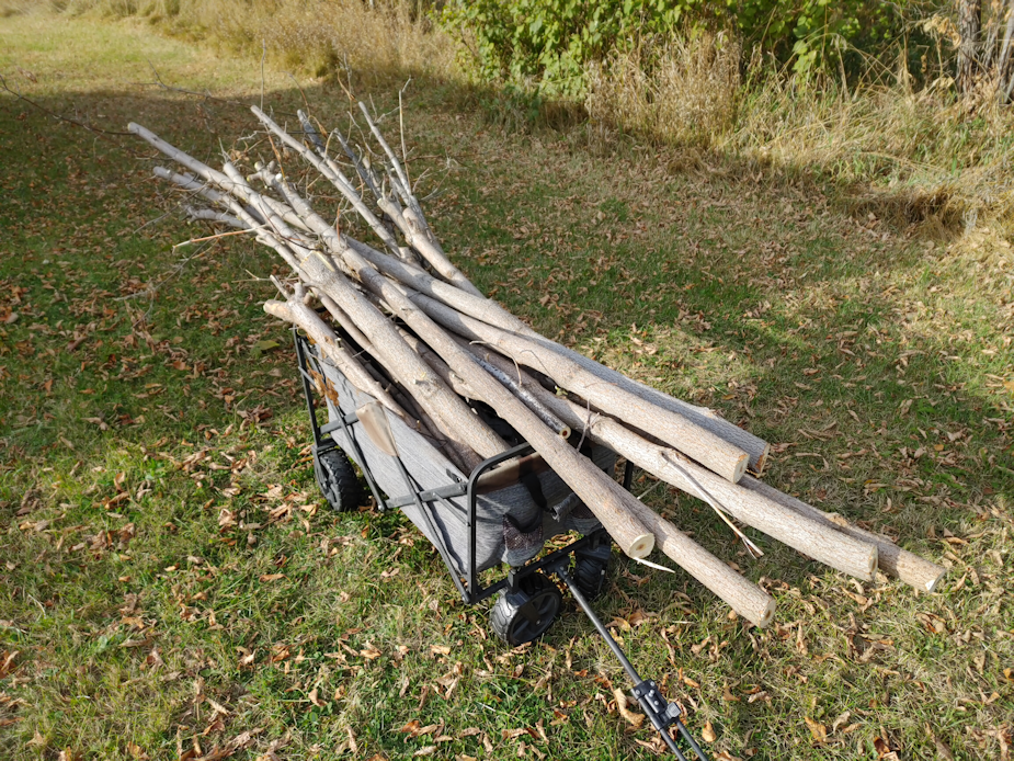 In the end, I messaged a daughter to come out and help me put things away, because I was losing the light so fast, so the remaining logs have been left where they are until tomorrow. Hopefully, it won’t be raining too hard, and we can haul them away and stack them. We may be able to use these pieces for when we make a new garden shed as our cordwood practice building. We’ll need a lot more, but the walls for the practice building will probably be only about 8 inches wide, instead of the 12 – 16 inches more typical of cordwood building. I still want to use the method for when we build an outdoor bathroom (NOT an outhouse over a pit), but we need to clear some very large dead trees before we can work in the area I want to build it in.