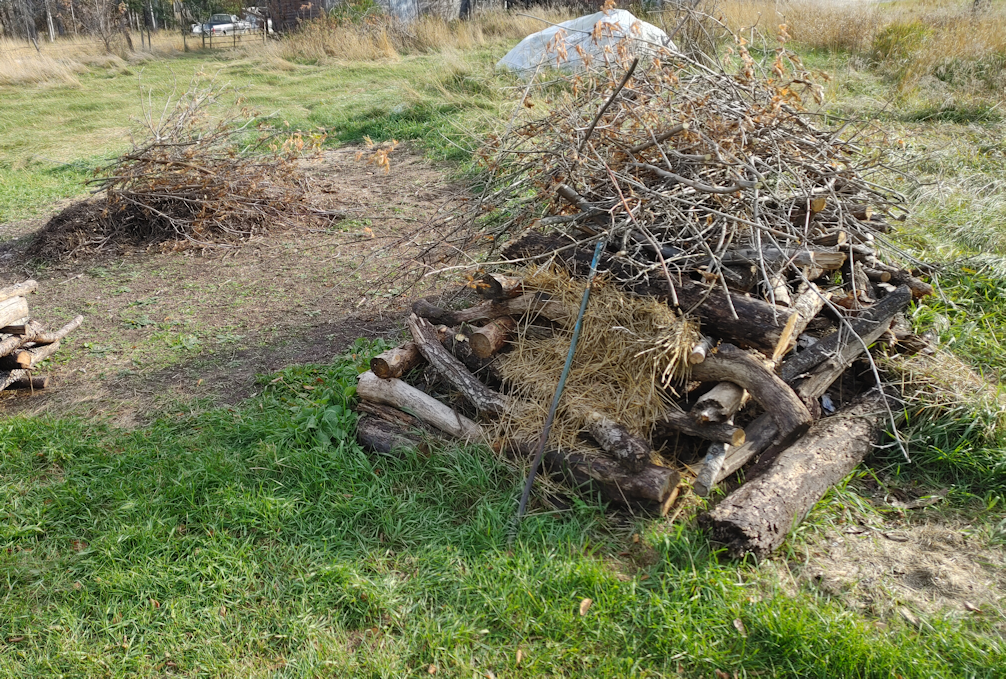 In the end, I had to stop because it was getting too dark. I left a section of the crab apple trunk alone, so that we could easily see it when we can finish cleaning it up later – likely in the spring. I was able to load three sections of the spruce tree’s trunk into the wagon to haul away (my apologies for the very fuzzy picture!) – that will NOT be going onto the burn pile, but will be stacked near the old garden shed – while a couple of larger pieces were left for later. The main thing is that there is now a cleared land that we can walk through – or drive through, if necessary.