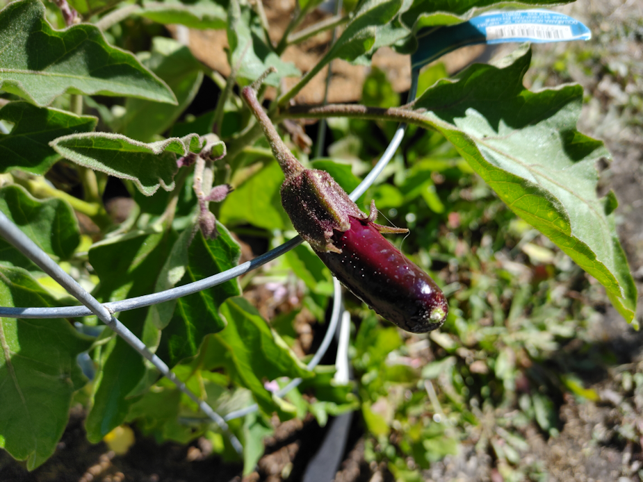 The one Little Finger Eggplant that is producing fruit is growing so fast!