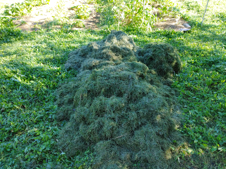 The girls got a nice big pile of grass clippings gathered for me. This is just from the south yards, which I cut a couple of days ago, so the clippings had time to dry in the sun a bit.