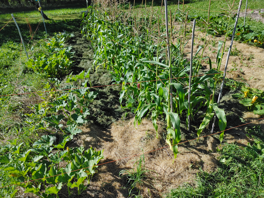 It was enough to finish mulching either side of the sweet corn, around the green bush beans, and most of the space between the corn. I did have to rake up more grass clippings from the north yard where I mowed yesterday to finish the job. The grass in the west yard is so sparse, there are no clippings worth raking up.