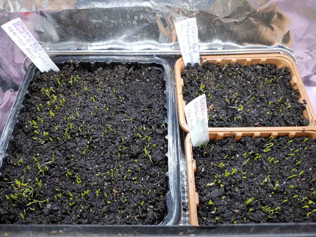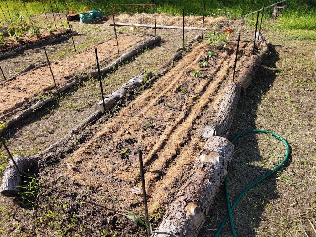 This bed is encircled with onions on the outside, while the inside has turnips on one side, spinach on the other. The turnips – all three varieties – germinated a couple days ago, and today I could just see little spinach coming up, too.