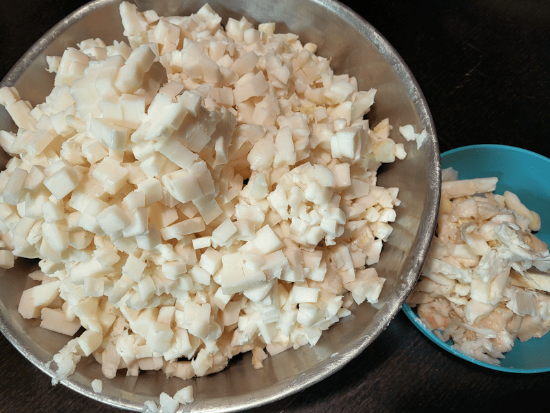 The small bowl on the side is the janky bits, with blood vessels or meat and the sliver skin. That was saved as a treat for the outside cats, which they were very happy to get!