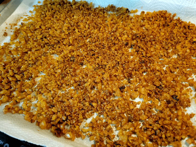 Here are the cracklings – after being flipped. It was too messy to try and take photos of the process. I have several of these 9×13 baking trays, so to flip it, I covered the top of the cracklings with more paper towel, put another baking tray on top, upside down, then carefully flipped the whole thing. Once flipped, the grease soaked paper towel was removed, scraping off as much of the stuck cracklings as I could, and thrown away.