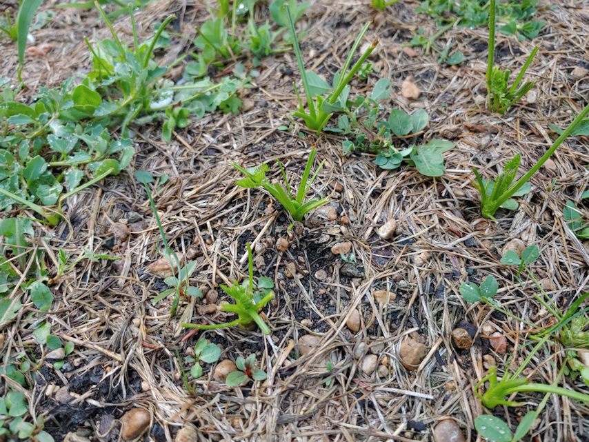 I trimmed the leaves and ends outside and took advantage of their huge leaves, using them as a mulch around where my daughter’s surviving double daffodils are trying to grow. Just one cluster has emerged, and they’re not doing well. We certainly won’t be getting any flowers from them this year, but if they can last long enough, hopefully their bulbs will have enough energy stored to grow and bloom next year.