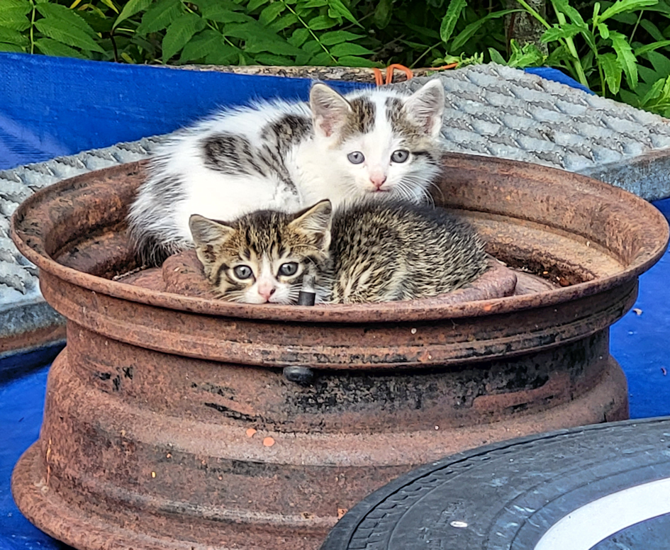 I was able to move a bit closer to get the photo, but I didn’t want to scare them away and didn’t push my luck. In the past, I would put trays of kibble for any kittens in this wood pile, but I’m seeing them by the kibble house so often, I’m leaving things be. Hopefully, they will start hanging out in the sun room with the other kittens.