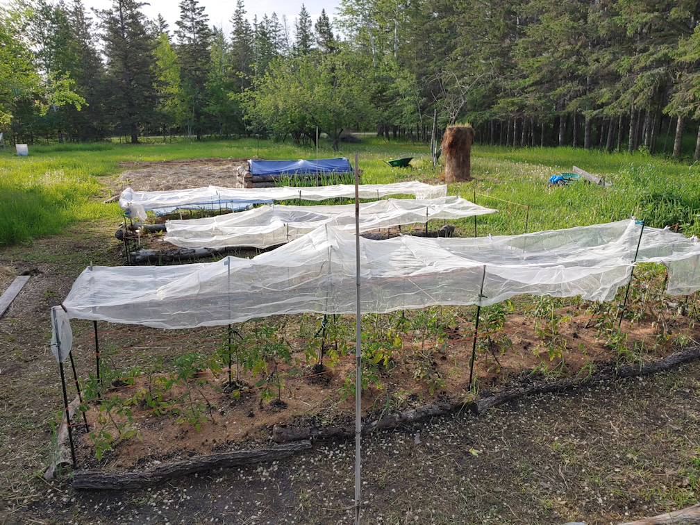 The old sheets went on the shorter beds with hoops. We didn’t try to cover the ends, so there would still be air circulation. As for the longer beds, we went with the mosquito netting. It won’t really provide shade, but it’s more a protection from hard rain or hail.