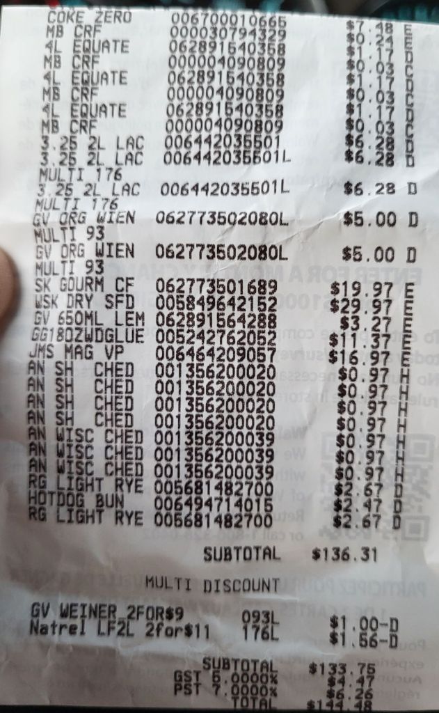 So of all this, $9.44 was for my mother. Which means that, of the $106.60 total, after taxes, we paid only $97.16 for our own stuff.