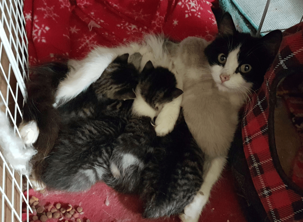 I don’t think any of those kittens are her own, and there are kittens from at least 3, possibly 4, litters that she is nursing!