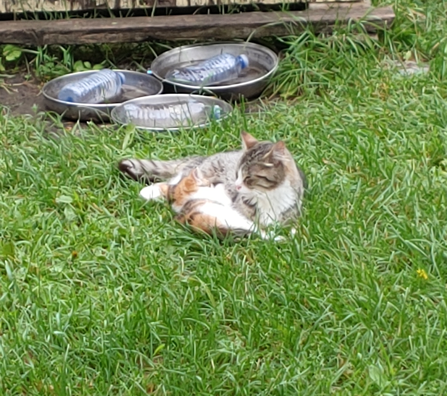 When it was time to stop for the day, and brought the cleaned food trays in and set them near the cat cage. Then I did an early cat feeding. I am still giving some cat soup for Frank’s babies, inside the cat cage, so I hope they’ll accept it and be okay with the new location. I put the littles inside the cage with the cat soup, but they left right away. They seem to prefer dry kibble more! Hopefully, Frank will also be good with the new location. While I was cleaning under the platform, she kept running in and out, looking pretty alarmed about the while thing.