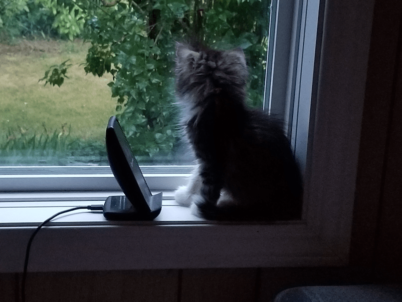 This is him next to my wireless phone charger. He can just barely clamber over it, when he wants to walk down the window sill. :-D