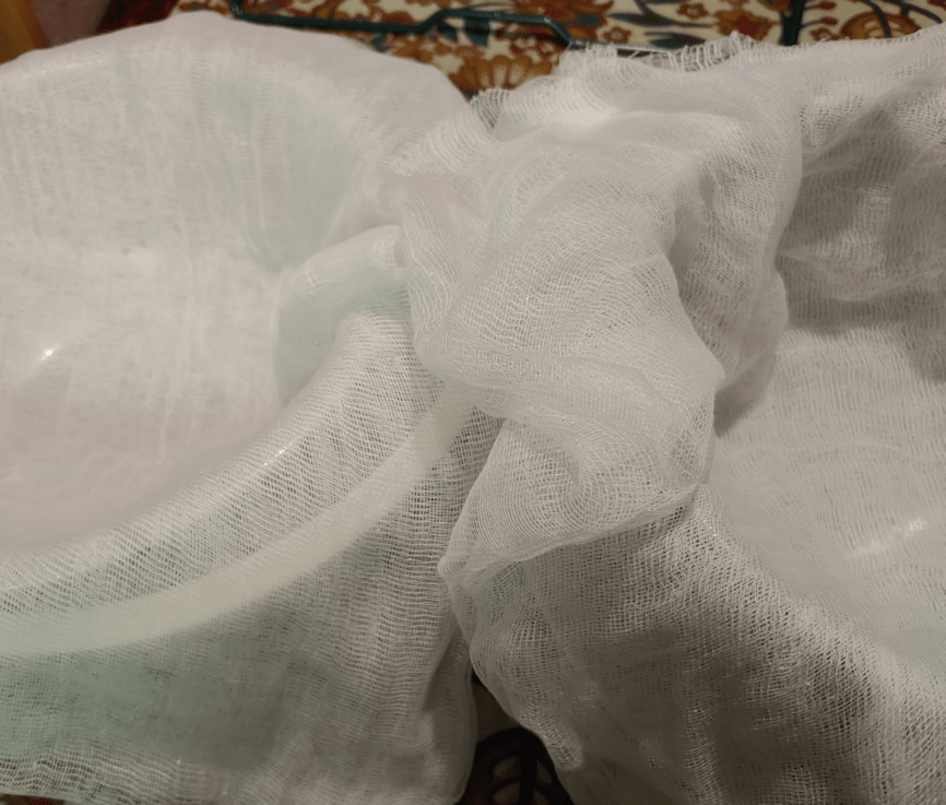I then left the bags to drain overnight, though we did cover the various bowls with whatever we had on hand. One got a piece of cheese cloth stretched over it, another bowl was the perfect size for our mesh frying pan splash screen, and the big measuring cup got covered by a large mesh sieve. These all allowed the juices to keep dripping in, while keeping out any dust, cat hair, insects or whatever else might be floating about.