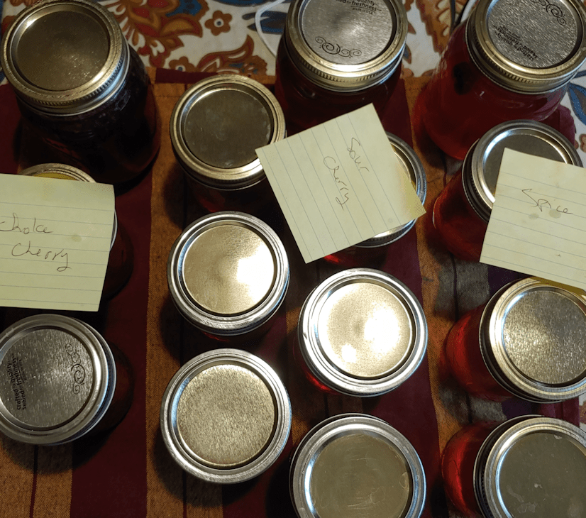This is the sour cherry batch on the left, choke cherry batch on the right. I forgot to get a picture of the spiced batch before I put it up to strain.