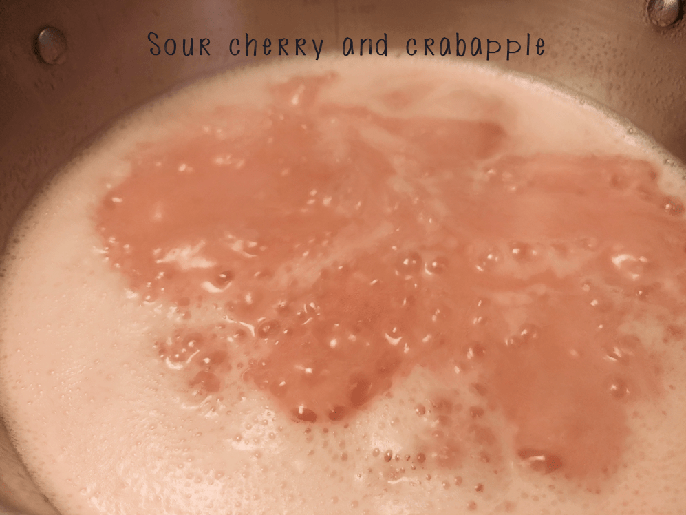 The pot the choke cherries were in turned out to be just a touch too small, and I had to transfer it to my other stock pot to prevent it from over flowing.