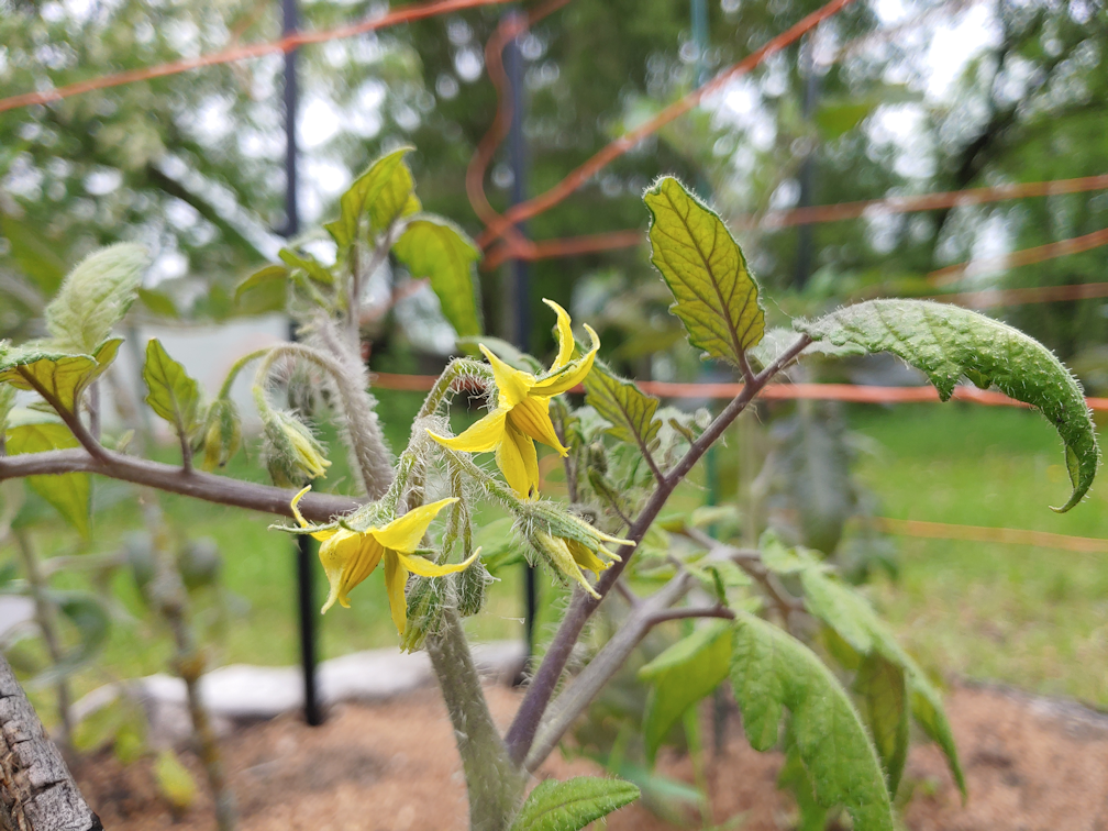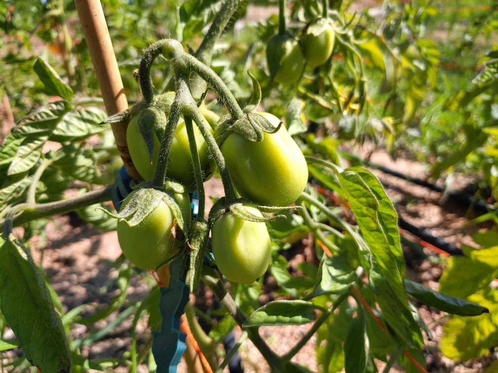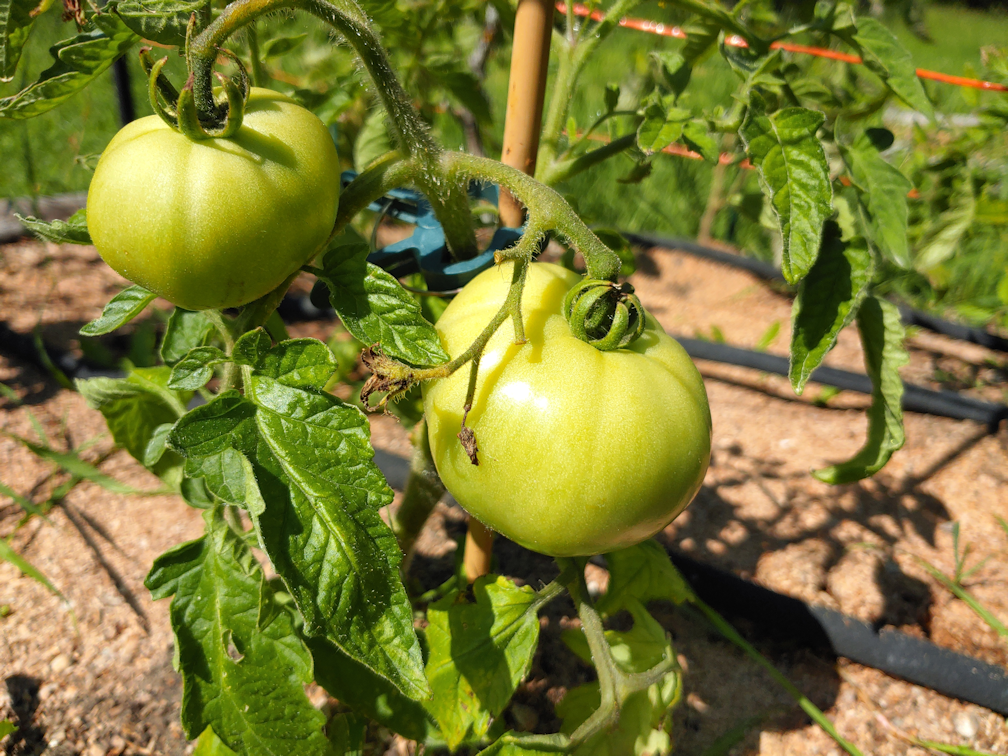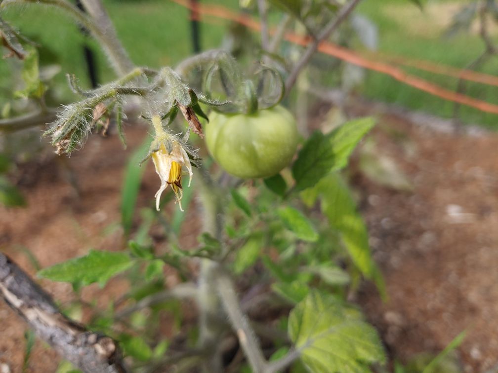 While the Chocolate Cherry and Yellow Pear tomatoes are not showing fruit yet, the tomatoes that were started so much earlier indoors are really starting to fill out! Almost all the plants are starting to show fruit now. The photo above is one of the first Sophie’s Choice tomatoes to develop, and it’s getting surprisingly large, from what I can tell for the variety.