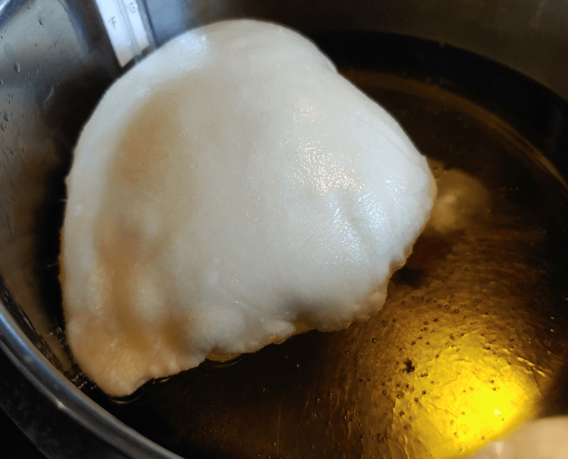 Once the oil was hot, the rolled out dough was fried, one at a time.