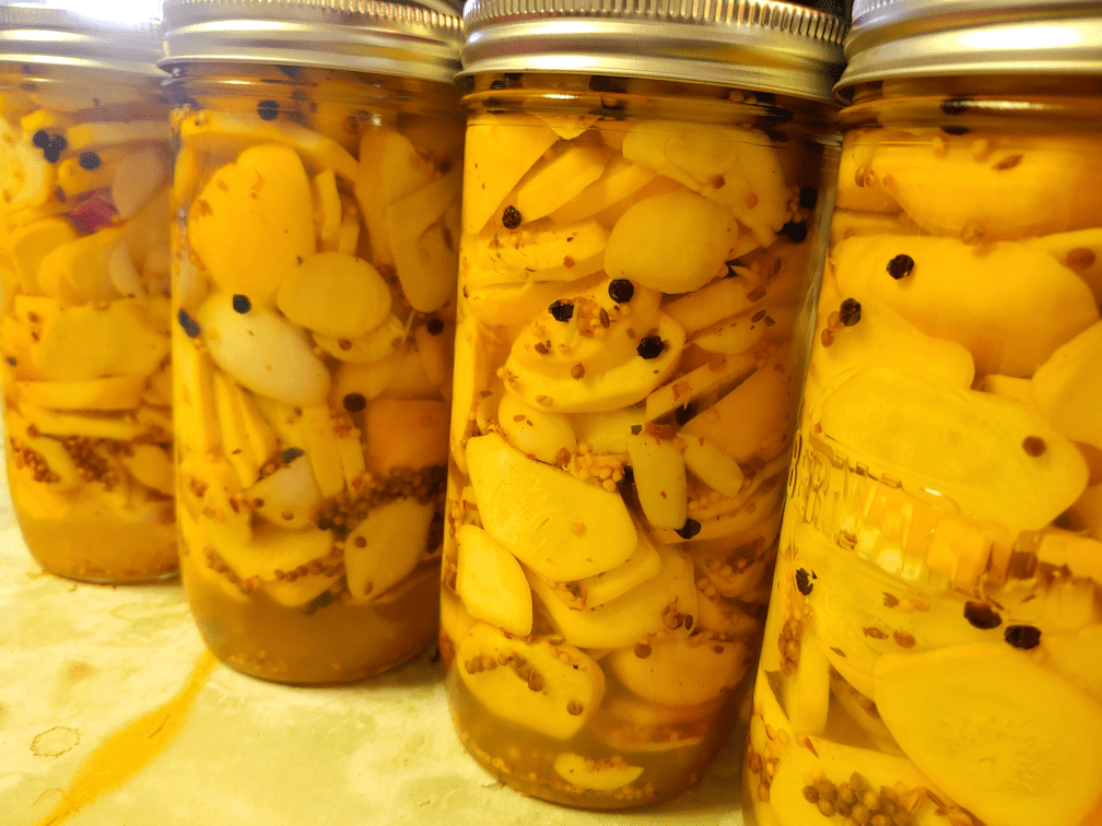 While I was outside, using the wood chipper, my daughter was busy dealing with our last summer squash!