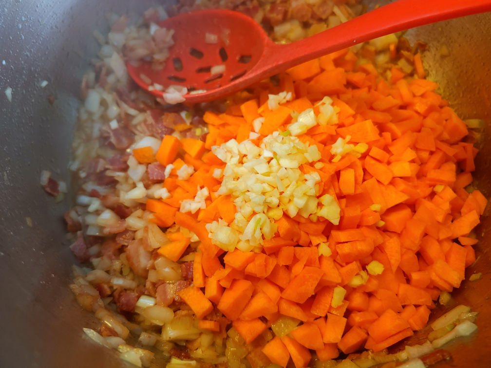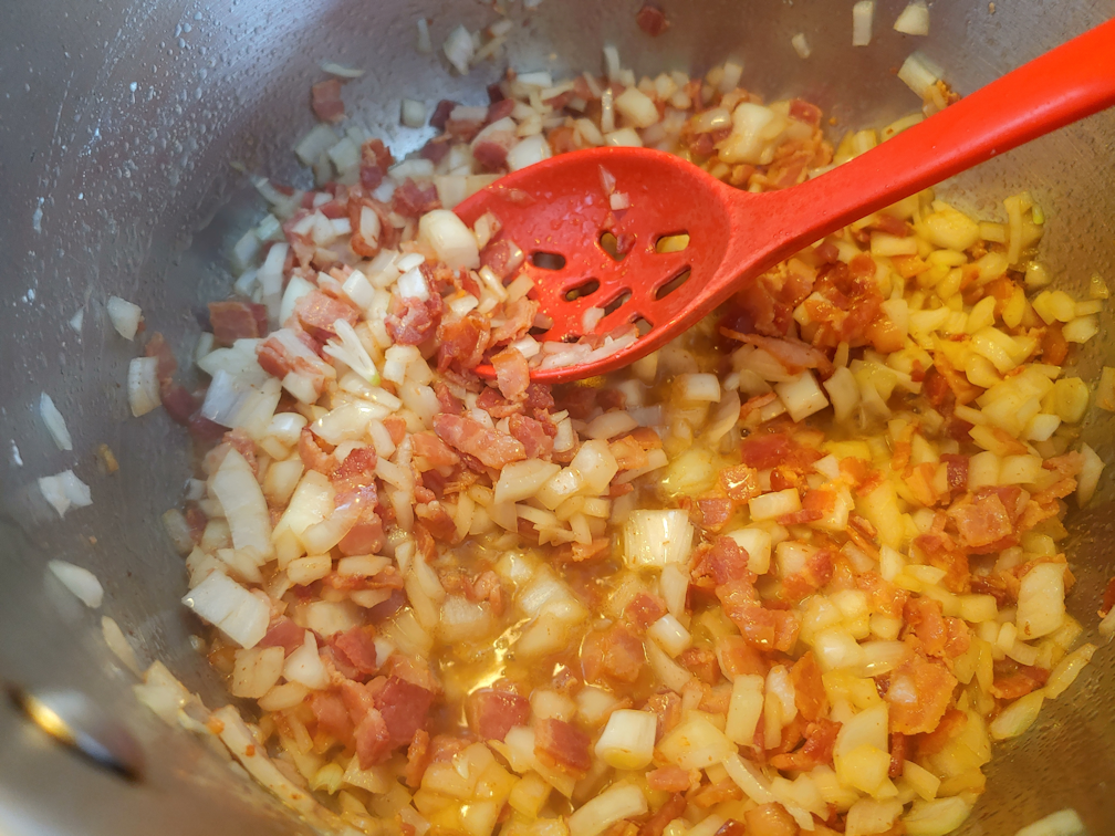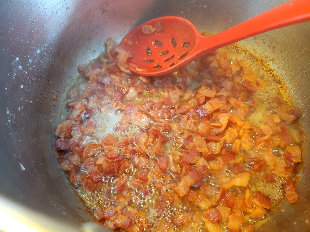 Start by cooking the bacon pieces in a large stock pot. If they seemed to be cooking unevenly, add a bit of water, which will help render out the fat more evenly, and deglaze the bottom so it doesn’t burn. Cook to desired doneness. I like it on the crispier side.
