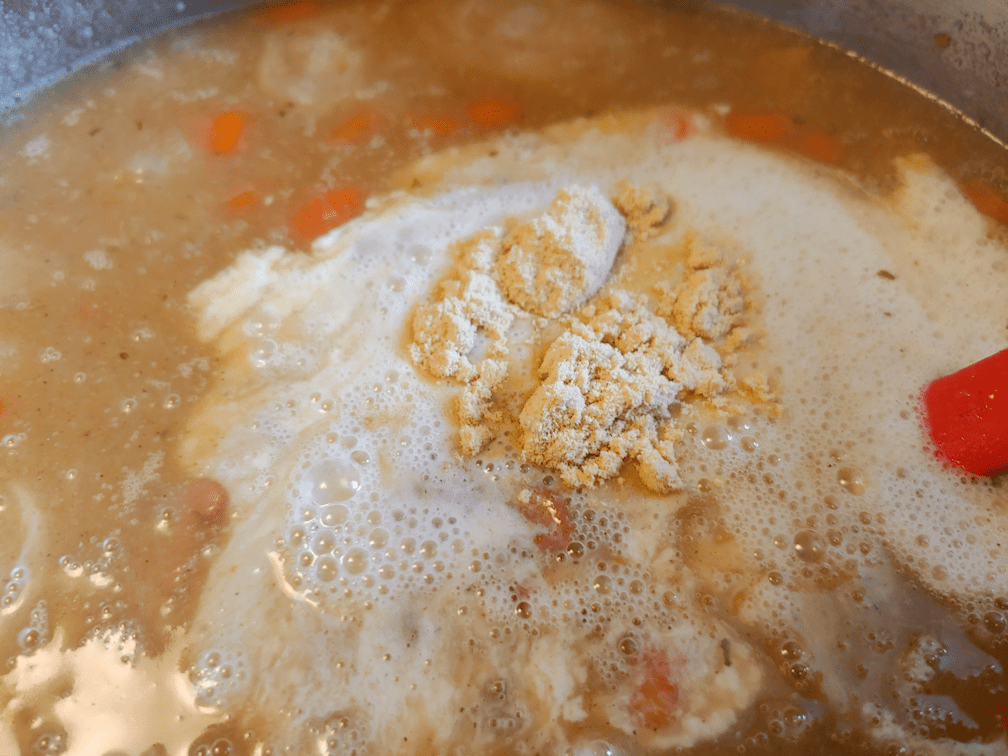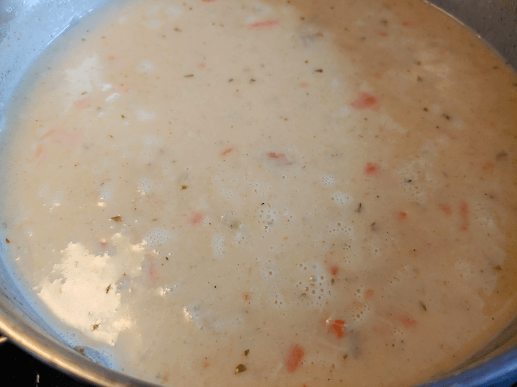 My daughter simmered the soup until the potatoes were soft, then added some diced roasted chicken. For the final creamy touch, she also added an 8oz block of cream cheese and took the immersion blender to the whole thing!
